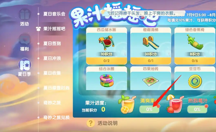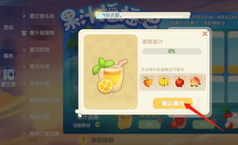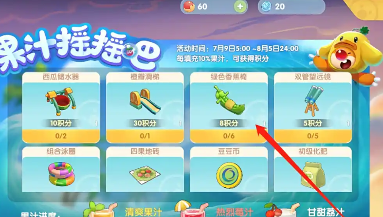 有了足够的水果后,就可以专心填充果汁来赚取积分了。清爽果汁、热烈莓汁和甘甜荔汁这三种果汁都能提升进度,每天每种果汁最多可以提升10%的进度。填充时要注意选择合适的水果组合,比如清爽果汁可以用香蕉、苹果、水蜜桃等水果来填充。每提升10%的进度就能获得6-12不等的积分,所以坚持每天填充很重要。积分攒够后,记得及时去兑换绿色香蕉椅,因为这个活动是限时的,错过了可能就要等下次了。