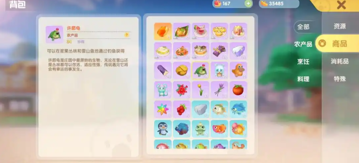 许愿龟是庄园里一种通体绿色、长得像乌龟的特殊生物,钓到它可别急着卖掉哦!它主要有两种用途:一是可以卖给花婶换成摩尔豆,二是送给NPC提升亲密度。虽然不能直接许愿,但传说遇到它会带来幸运,所以留着总没错~