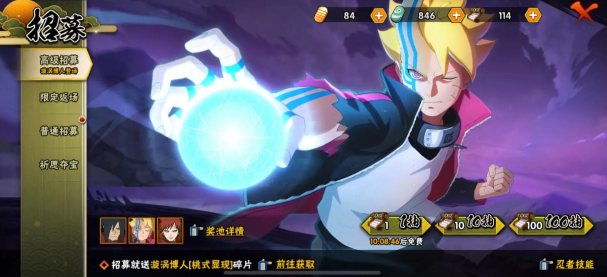 除了新手活动,高级招募也是获取A忍的重要途径。高级招募会定期推出强力A忍,通过消耗金币或高招券进行抽卡。建议提前攒够金币,等到新A忍上线时集中抽取,这样能利用首付机制获得更多碎片。如果运气不错,甚至可能直接抽到整卡。平时记得多参与日常和周常任务,这些都能帮你稳定积累金币,为高级招募做好准备。