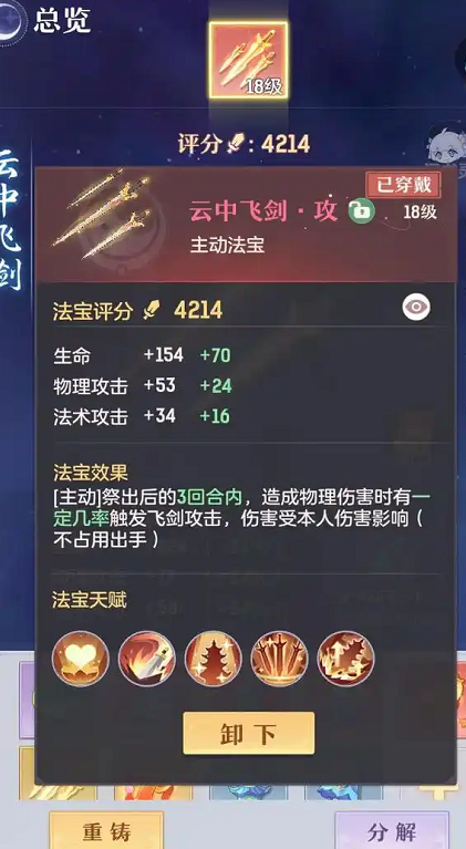 弈剑作为物理输出职业,核心法宝首选云中飞剑。这个法宝能在你造成物理伤害时概率触发飞剑攻击,输出越高飞剑伤害越强,完美契合弈剑的爆发特性。施放技能后3回合内都有机会触发,相当于白送额外伤害。前期如果暂时拿不到红色品质的云中飞剑,可以先用其他高稀有度法宝过渡,等完成御灵手册任务后直接选红色自选箱兑换。