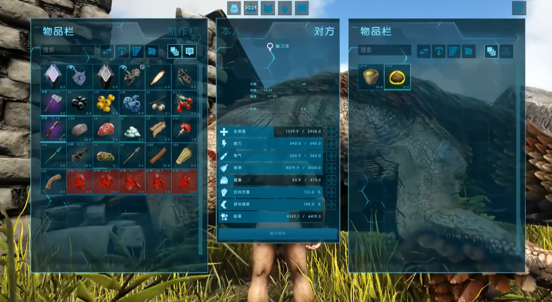 镰刀龙虽然移动速度不快,但那双大爪子能轻松撕碎食肉动物,属于孤独的素食者。它主要分布在内陆森林和平原附近,驯服前最好带5-10个金属广告牌和大型捕兽夹。可以用金属广告牌摆成C字形困住它,再消耗其饥饿度后用麻醉镖击晕。记得困住后不要靠近,它的攻击带破甲效果。