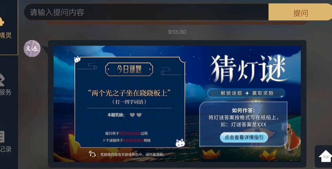 猜灯谜活动一般藏在游戏右上角的设置里,点开小精灵图标就能找到入口。每天登录会送一次答题机会,题目都和游戏内的生物或场景相关,比如八个小脚抬面鼓答案是螃蟹。答对后不仅能拿爱心或蜡烛奖励,累计参与还可能触发隐藏任务,完成指定次数就能兑换兔子头饰碎片。别忘了活动时间有限,建议定个闹钟提醒自己每日打卡。