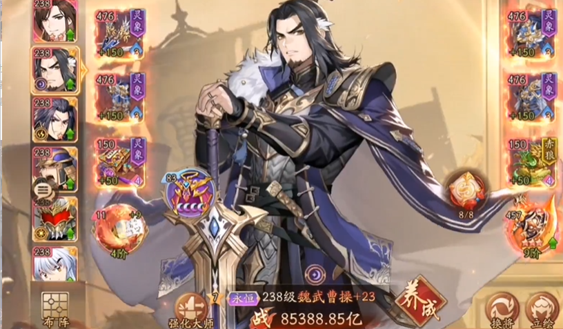 曹操作为魏国核心金将,拥有强大的群体控制和伤害能力。他的技能主打冰冻效果和破冰爆发,战斗中能有效限制敌方行动并创造输出机会。普通攻击为全体AOE,怒气技能可对敌方全体造成高额法术伤害,并有概率附加不可驱散的冰冻状态。被冰冻的目标若被曹操攻击破冰,会额外受到基于最大生命值的伤害,这种机制让他在持久战中越战越强。
