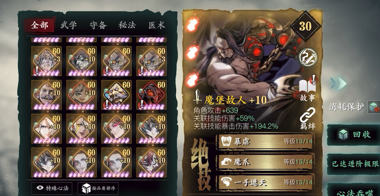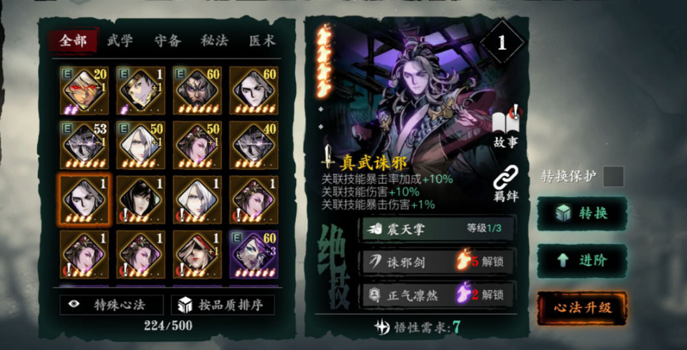 当心法达到60级后,可通过消耗特定心法进行升华,升华后的心法不仅外观变化,绝技等级上限也会提高。升华形态的心法在释放时会显现特殊特效,同时羁绊效果也会得到增强。需升华需要大量同类心法作为材料,平民玩家需要较长时间积累。