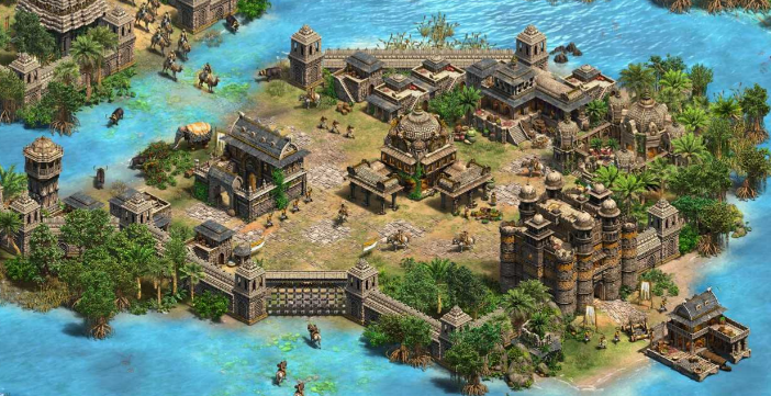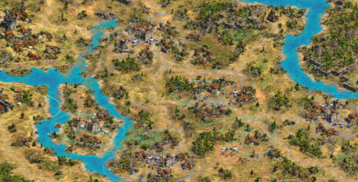 整张地图开阔平坦,资源分布均匀,但树林和石头偏少,很难用城墙完全保护基地,所以前期就要做好防守准备。鹿群是主要食物来源,几乎没什么鱼可捞,海军基本派不上用场。因为地形开阔,大规模部队作战很常见,但也要小心敌人从四面八方偷袭。如果喜欢刺激的早期对抗,这张图绝对不会让你失望。