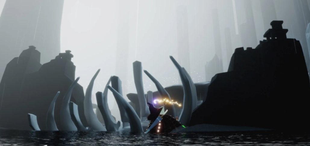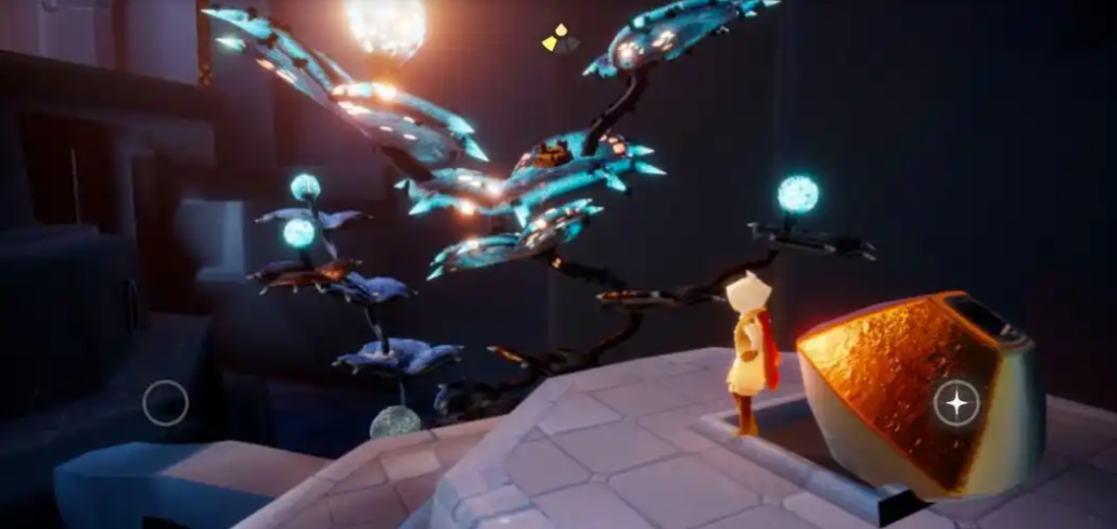 鱼叫声的获取需要前往雨林地图的最后一张图。玩家进入雨林后,向左飞行至破碎的塔附近,可以看到一个巨大的骨架结构,上面覆盖着黑色蘑菇状的黑暗植物。使用蜡烛将这些植物全部烧毁后,即可触发鱼叫声先祖的解锁流程。完成烧花操作后,需将该先祖护送回神庙进行供奉,之后在遇境中消耗蜡烛升级先祖节点,最终可永久获得鱼叫声动作。