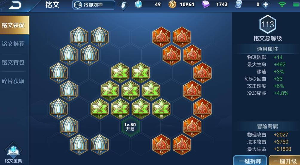 除了装备,铭文的选择对推塔流刘禅也很重要,好的铭文能让你在开局就获得优势。通常推荐搭配一些增加生命值、冷却缩减和物理防御的铭文。比如红色铭文可以带宿命,增加最大生命、物理防御和攻速;蓝色铭文带调和,提供生命值、每五秒回血和移速,这对前期对线和续航帮助很大;绿色铭文则可以选择虚空,增加生命值和冷却缩减。这套铭文搭配能让刘禅一级就比别人更肉,技能转得也稍微快一点,上线后可以打得更有侵略性,为后续的推塔节奏打下基础。