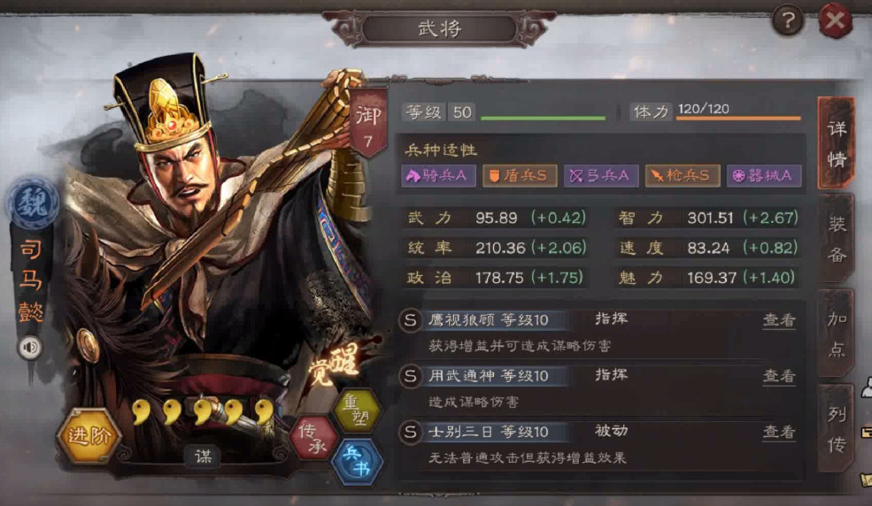 接下来聊聊给这两位核心武将搭配战法的心得。诸葛亮的战法选择,核心思路是强化其控制和辅助能力,同时补充一些伤害或治疗。夺魂挟魄是很多玩家的首选,因为它能偷取对方的属性,让诸葛亮自己更硬,输出更高,同时削弱对手,是一举多得的好技能。另一个不错的选择是杯蛇鬼车,能打能奶,增强了队伍的持续作战能力。如果队伍需要更多的减伤和控制,八门金锁阵、料事如神这类战法也很好用。给诸葛亮加点,一般全智力就行,如果想让他先手打断,也可以适当调整一下速度。司马懿的战法搭配则相对固定,目标是保证他稳定活到后期并打出爆炸伤害。最经典、也是公认最强的搭配是用武通神加士别三日。这两个都是指挥战法,不会被控制打断,用武通神从第二回合开始每偶数回合稳定造成伤害,士别三日前3回合提供规避保命,第四回合还能打一波谋略伤害,完美契合司马懿后期发力的特点。如果没有这些顶级战法,也可以考虑熯天炽地、四面楚歌等主动谋略伤害战法来过渡。