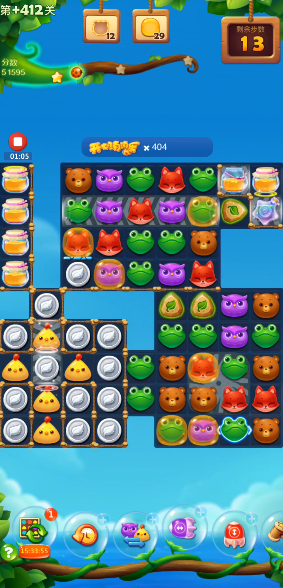 开局后尽快拿到小木锤道具,用它来砸掉画面中的蓝色河马,这个操作会触发连锁反应生成小黄鸡自动组成爆炸特效,接着专注于收集关卡内带钥匙的动物,成功拿到所有钥匙后可以开启封锁的门,这时要注意左下角黄色小鸡的位置,通过移动让它激活星星瓶道具。