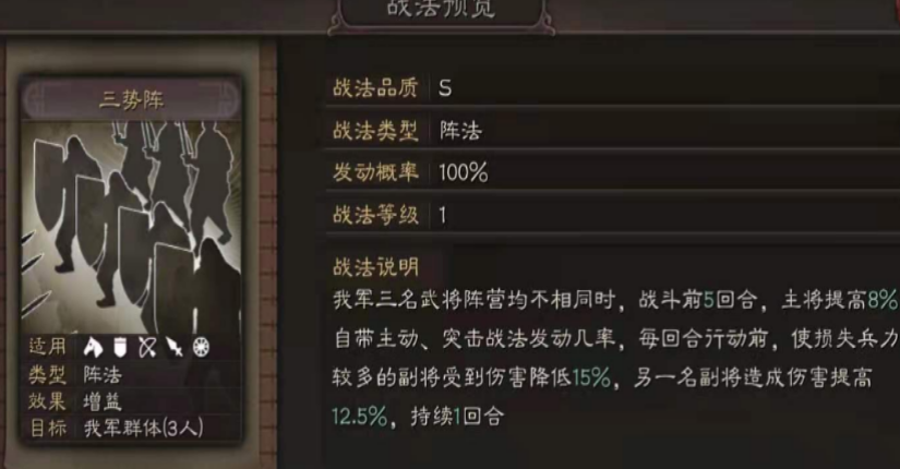 了解了需要什么武将去兑换,我们再来看看这个三势阵到底有什么用,为啥大家都说它值得换。这个战法的效果可以说非常强力,它专门为那些由三个不同阵营武将组成的队伍服务。在战斗开始后的前五个回合里,它能显著提升你主将那个自带主动战法或者突击战法的发动概率,这个加成对于依赖主将爆发输出的队伍来说提升非常明显。它每回合还会自动照顾你的两名副将:让当前兵力损失最多的那位副将受到的伤害降低,而让另一名副将造成的伤害提高。这样一来,你的队伍在前几回合里既有更高的爆发机会,又兼顾了一定的生存能力,攻防两端都能得到很好的补充,算是一个功能性非常全面的阵法。