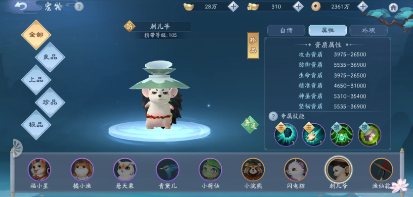 它在玩家之间的名声主要是PVP,也就是玩家对战里表现比较突出。它的技能里有一个定身效果,虽然触发几率不是百分之百,但在论剑这种一对一单挑的时候,如果能成功控住对手,尤其是对那些本身位移能力不算强的职业来说,能创造不错的输出机会。除了控制,它还有增加自身闪避和反弹伤害的技能,算是一只功能比较全面的宠物。如果你是喜欢打论剑,并且玩的是像日月、无相、华山这类通常需要在近身缠斗中找机会的职业,那么刺儿爷会是一个值得重点考虑的选择,它的控制能力可能成为你制胜的关键。