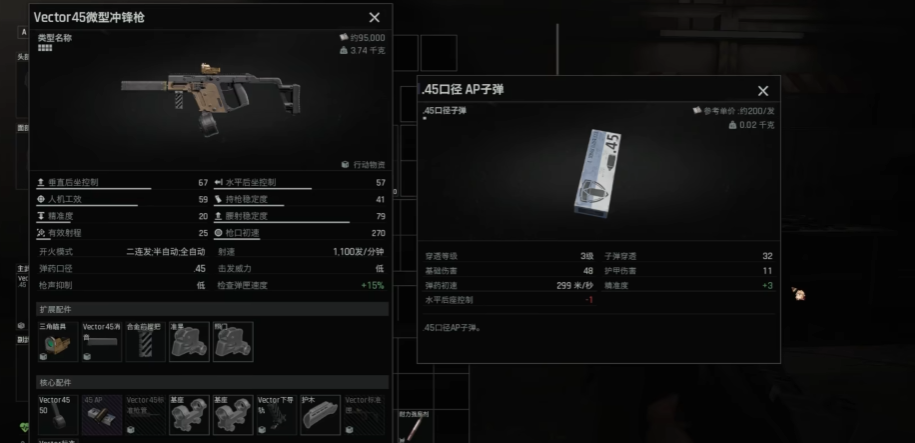维克托系列冲锋枪一直是玩家们热议的焦点,尤其是Vector9和Vector45这两把武器。Vector9使用9毫米子弹,射速约为950发每分钟,在同口径武器中表现突出,适合在近距离交战中快速压制对手。Vector45则采用.45口径弹药,射速达到惊人的1100发每分钟,是当前游戏中射速最快的枪械,其单发伤害和穿透力也更具优势。