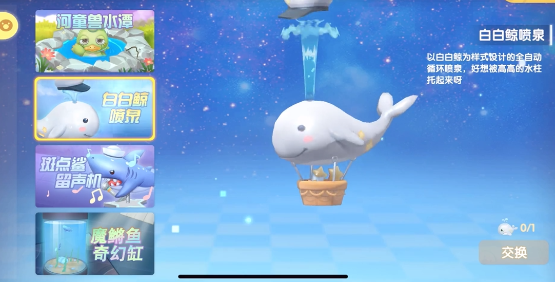 当你历经千辛万苦终于把白白鲸钓上来之后,可别只是把它放在背包里哟,它有一个特别棒的用途。你可以带着钓到的白白鲸,去爱心广场找到一位叫大力的NPC,他那里有个神秘商店。在商店里,你可以用这只珍贵的白白鲸兑换一个非常漂亮的家具,叫做白白鲸喷泉。这个喷泉可不是普通的装饰,它摆放在你的家园里特别显眼、有气势,而且还是一个可以互动的特效家具,算是家园装饰里非常珍稀和值得收藏的一款了。