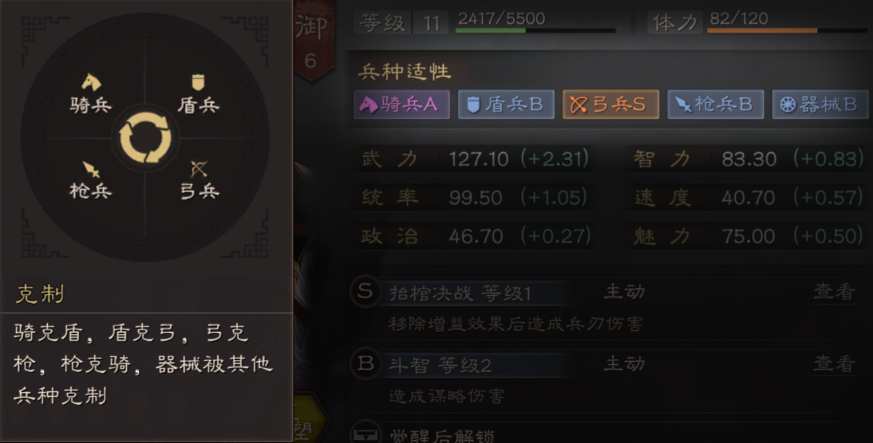 兵种适应性也是搭配时必须严格照看的细节。每个武将都有自己擅长的兵种,适性分为S、A、B、C几个等级,S级能发挥120%的属性,是首选。组建队伍时,尽量让队伍里的三个武将都能转换到同一个S级兵种,比如三个都是S枪兵或者S弓兵,这样队伍的战斗力最强。如果实在凑不齐,也要保证整体收益最高,比如两个S加一个A,也比一个S加两个A要强。要时刻牢记兵种间的克制关系:枪兵克骑兵,骑兵克盾兵,盾兵克弓兵,弓兵克枪兵。在打地或者打架前,最好能侦查一下对手的兵种,然后用克制的兵种去应对,能大大降低你的战损,提升胜率。