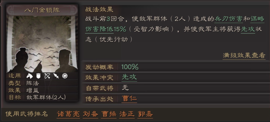 在战法搭配上需要根据赛季环境进行选择,关羽通常担任主控场和输出,推荐携带箕形阵和绝其汲道,前者能有效削弱敌方主将的输出,后者的禁疗效果在对付各种回复队伍时非常关键,赵云因为自身拥有洞察效果,最适合携带破阵摧坚和卧薪尝胆来提供稳定的属性削弱和补充控制,张飞则负责补足破防和群体伤害,可以携带刚勇无前配合据水断桥或者横扫千军来打出高额面伤,如果缺少某些核心战法,也可以用落凤、纵兵劫掠这类A级战法进行替代。