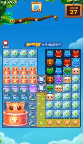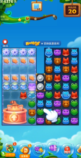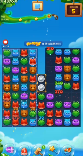 制造和利用特效是突破此关的关键手段。当四个相同动物连成直线时可以产生爆炸特效,用于清除整行或整列的障碍,而五个动物连成一线则能生成魔力鸟,它的威力巨大,与任意一个普通动物交换即可清除全场所有同类动物。更有效的方法是将魔力鸟与直线特效或爆炸特效相邻交换,能触发范围极广的清屏效果,这对于快速消除4376关中厚实的冰层或集中的障碍物非常有帮助,因此每一步操作都应尽量朝合成这些强力特效的方向努力。