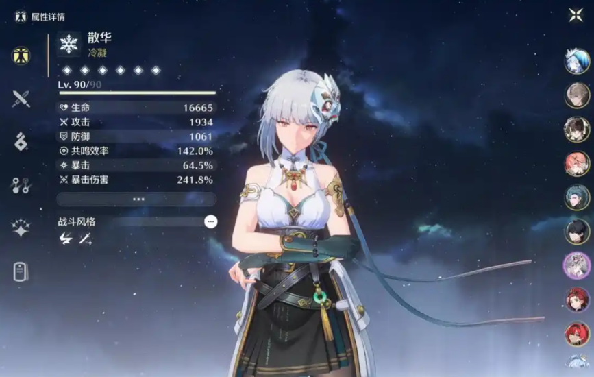 若要充分发挥散华的战斗力,在武器和声骸配置上需有所侧重。武器方面,五星武器千古洑流凭借其暴击率副词条是最优选择,能有效降低声骸的搭配压力;四星武器中,飞景或锻造武器斩瞬刀是不错的过渡与替代选择,它们能提供攻击力加成并强化重击伤害。声骸套装前期推荐轻云出月与凝夜白霜的2+2组合作为过渡,后期可考虑轻云出月五件套来优化循环;词条选择上,应优先保证暴击率与暴击伤害,其次追求攻击力与共鸣效率等属性。