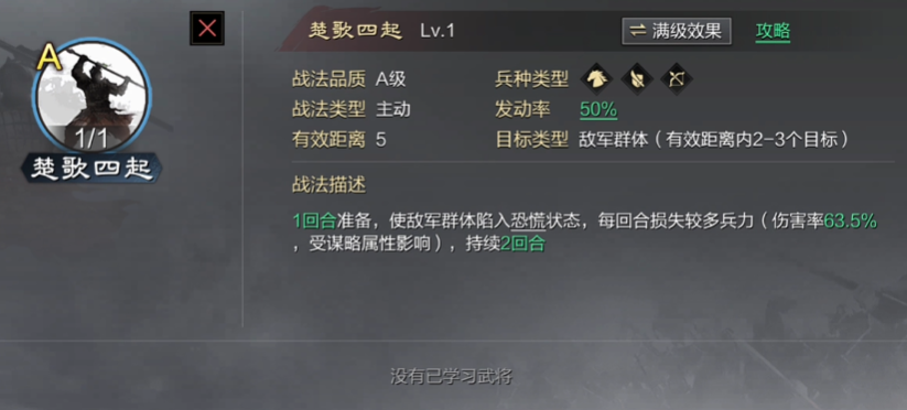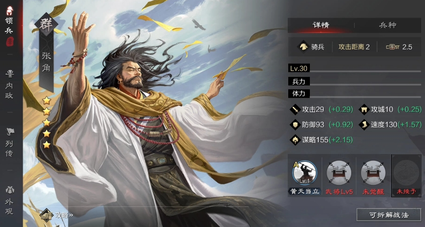 张角的输出优势在于其自带战法黄天当立能够提供稳定的群体持续伤害。该战法需要一回合准备,发动率为35%,但其效果可以覆盖敌方全体三个目标,并附带持续两回合的妖术诅咒效果。这种机制使得张角在持久战中表现突出,深谋远虑等战法可以进一步提升其伤害叠加效率,但也因其防御属性较低而需要阵容保护,且妖术诅咒效果容易被镇静类战法所清除,这在一定程度上影响了其输出的稳定性。