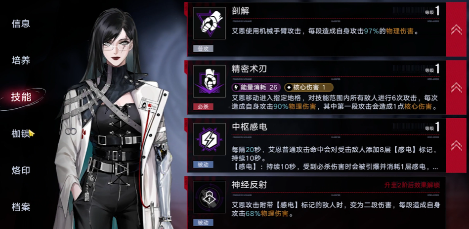 艾恩是一名A级危系禁闭者,职业为诡秘,这一定位意味着她具备一定的核心击破能力。她的普通攻击解剖使用机械手臂进行物理攻击。其核心技能精密术刃是一个消耗17点能量的必杀技,效果是艾恩移动至指定地格,对技能范围内的所有敌人进行6次攻击,每次造成一定比例的物理伤害,并且第一段攻击可以造成1点核心伤害。她的被动技能中枢感电会周期性为普通攻击命中的敌人添加感电标记,该标记在被其他必杀伤害触发时会引爆,造成额外的法术伤害。另一个被动神经反射则让艾恩攻击带有感电标记的敌人时,普通攻击会变为二段伤害。