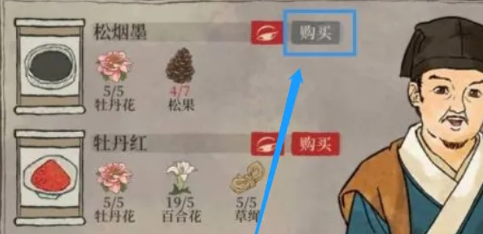 获得松墨材料的标准方法是前往特定商店进行兑换。玩家需要进入名为飞泉绿的商店,使用指定数量的材料方可换得该物品,这是获取松墨最直接且主要的途径。兑换松墨所需的具体材料组合固定为五个牡丹花和七个松果。松果作为一种基础采集材料,相对容易从地图场景中的松树资源点通过消耗体力采集获得;而牡丹花则并非直接采集,它是一种合成物品,需要玩家在探索过程中收集牡丹花、百合花以及草绳这三种基础素材后方能合成。