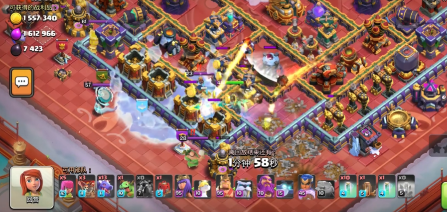 进入关卡后观察阵型,可以发现其防空能力确实存在短板,这为空中突袭创造了条件。具体的进攻操作首先从地图的右下方中间位置开始,在那里放下熔炉猎犬来吸引并承受初始的防御火力。紧接着,使用两个冰冻法术冻住熔炉猎犬前进路径上或周边的关键防御建筑,例如箭塔或法师塔,以保护它存活更长时间。当熔炉猎犬吸引住火力后,主力部队需要从多个方向投入战场以分散剩余防御的伤害。可以从地图的上方和下方两侧依次放下飞龙和气球兵。飞龙可以先行清理外围建筑并为气球兵开路,而气球兵则应直接瞄准防御建筑进行攻击。在部队聚集或遭遇核心防御区时,看准时机放下狂暴法术,可以大幅提升飞龙和气球兵的破坏速度,快速清理一片区域。