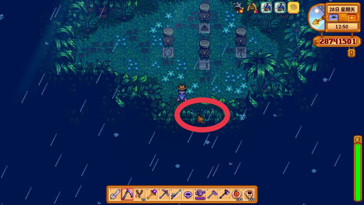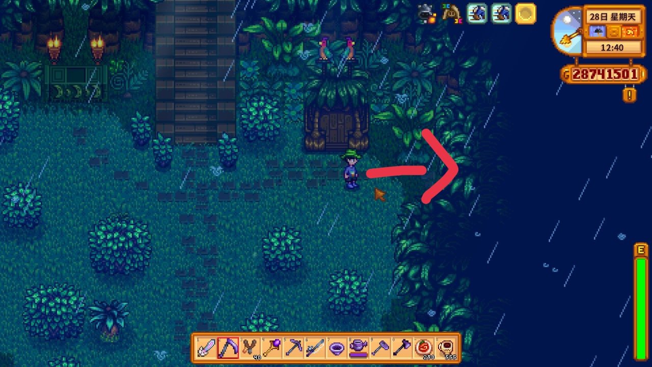 完成上述步骤后,玩家可以探索丛林区域,但雨林神庙的完全显现或深入探索,通常关联着一个特定的解谜任务,即宝石鸟谜题。要找到并进入更深层的神庙,需要完成这个收集任务。姜岛下雨时,会有发光的宝石鸟随机出现在四个固定区域:岛屿农场的中部、码头海滩的中间、雷欧家门口以及贸易小屋右上方的椰子树附近。靠近这些鸟,它们会掉落一颗宝石(如海蓝宝石、黄水晶等)。玩家需要收集齐至少四颗不同颜色的宝石。