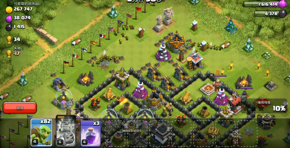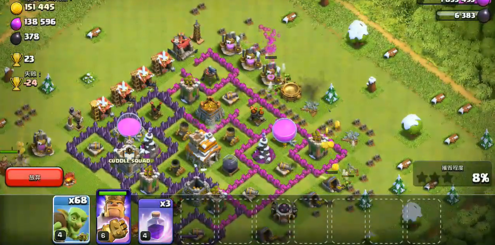 面对不同阵型需灵活调整冰法投放位置,回字阵与核心密集阵,冰法应贴近核心区域放置,最大化减速覆盖范围;分散阵型则分批次下冰法,配合冰人分段控场,逐步推进清理建筑。进攻过程中时刻观察冰法血量与防御锁定目标,及时用小部队吸引火力,避免冰法被单点防御秒杀,同时预留部分冰法与弓箭手,在主力部队拆除核心防御后,快速清理外围建筑,确保百分比与摧毁率达标。