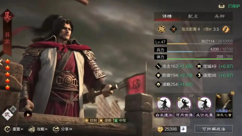 实战作战时优先寻找菜刀队、主动战法突击队等目标交战,利用吕蒙前两回合的双重封锁,让敌方无法打出有效伤害,陆逊在安全环境内蓄力释放火势风威,配合十面埋伏快速打出群体爆发,孙策则在前锋位稳步叠加伤害,逐步收割残局。遇到高减伤盾兵、肉步队伍时及时撤退,此类队伍谋略防御极高且续航充足,会大幅拖慢输出节奏,导致陆逊爆发难以击穿防线。交战过程中无需刻意调整出手顺序,依靠弓兵兵种特性与属性加点,即可保证控制与输出节奏连贯,全程以控场压血、持续灼烧、稳步收割为作战逻辑。
