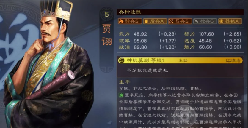 五谋骑是荀彧的顶配组合,SP荀彧、贾诩、SP郭嘉全员骑兵适性优秀,依托五谋臣缘分提升全队属性,SP荀彧承担主将与核心辅助职责,提供稳定减伤、续航与控制反弹,贾诩主打混乱与持续谋略伤害,SP郭嘉负责先攻、减伤与保护核心,这套阵容兼具免控、减伤、爆发与续航,面对主流骑兵、弓兵队伍均有稳定压制力,兵种选择飞熊军可进一步提升持续输出,依靠高频主动战法与混乱效果打乱敌方节奏,让队伍在多回合鏖战中持续占优。