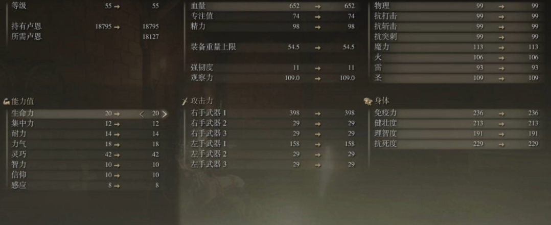 刚开始玩的小伙伴们可能会对属性加点有点懵,其实不用太纠结,咱们先记住一个原则:前期优先保证生存,后期再根据武器和玩法调整。生命力、耐力和集中力是开荒阶段最需要关注的属性,先把血量堆到15-20点,这样不容易被小怪一刀秒。耐力则决定了你能砍几刀或者翻滚几次,建议加到能流畅打完一套连招的程度。如果想玩法系,集中力也得适当点一些,不然蓝条不够用会很尴尬。