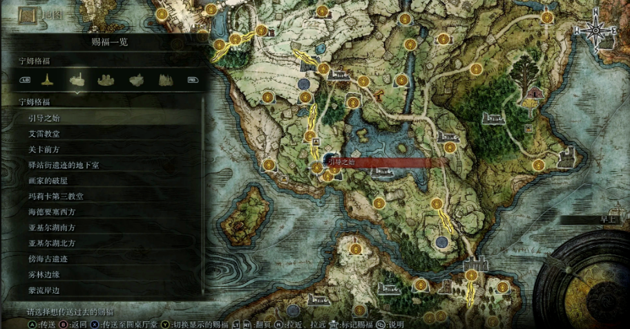 开局地图位于宁姆格福地区,这是玩家完成新手教程后首次进入的开放区域。从漂流墓地苏醒后,沿唯一路径前进即可抵达这片被黄金树光芒笼罩的初始之地。宁姆格福分为东西两部分,西部地势相对平缓且敌人强度较低,适合新手熟悉基础操作;东部则包含啜泣半岛等进阶区域,但建议在等级提升后再前往探索。该区域地图碎片通常可在主干道路旁的方尖碑状石碑下获取,激活后能清晰显示地形与赐福点位置。