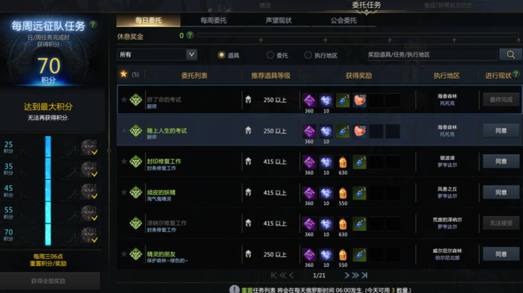 每周任务与每日任务共享同一入口,但两者的刷新机制不同。每日任务每天刷新,而每周任务在固定时间重置,通常为服务器维护后的每周三。任务内容涵盖副本挑战、收集、对话等多种形式,部分任务需要先完成特定前置条件。某些岛屿任务或声望任务可能要求玩家先解锁对应区域或NPC。建议优先选择与当前角色成长路线匹配的任务,以最大化收益。