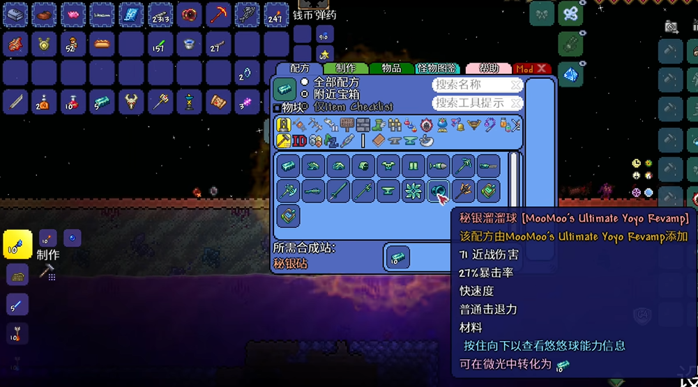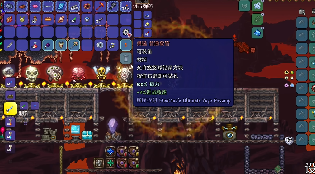 悠悠球这武器挺特别的,算是近战,但又可以丢出去打一段距离,所以搭配装备的思路和其他近战武器会有点不一样。游戏里悠悠球选择很多,从最开始用10个木材和20个蛛网就能在工作台合成的木悠悠球,到后期各种强力款式。前期如果想追求不错的伤害,可以去地下丛林收集藤蔓、毒刺和丛林孢子来制作亚马逊球,它在游戏早期算是相当给力的选择。而悠悠球的终极毕业武器,那肯定是泰拉悠悠球了,这把武器拥有190点的高额基础伤害和25格的超长射程,还能无限停留在空中并自动发射追踪弹球,它的获取方式是在困难模式后期击败月球领主,有11.11%的几率掉落,是所有悠悠球玩家的终极追求。