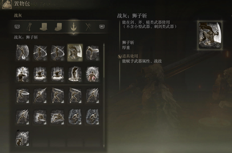 战技的种类非常多,效果也千差万别。比如有居合这样追求快速出刀斩击的,也有狮子斩这种高高跃起造成强力一击的。 有的战灰会根据你赋予的属性产生不同效果,比如厚重系的岩石剑可以提升武器的攻击力,而优质系的风暴刃则可以释放出范围伤害。 另外有一个很实用的技巧,你可以通过给左手盾牌赋予无战技这个战灰,这样在举盾防御时,你依然可以顺畅地使用右手武器的战技,这对于很多近战流派来说是个非常实用的选择。 前期开荒时,像猎犬长牙这把武器自带的战技就非常受欢迎,它带有后撤位移效果,能帮你躲开不少攻击,而且削韧效果也不错。