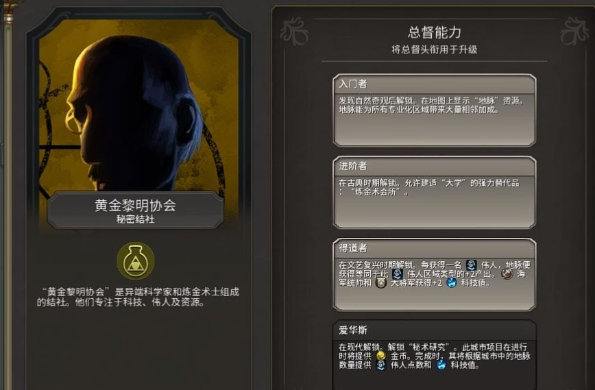 每个秘密结社的总督都可以逐步解锁四个强大的升级,这些升级并非立即全部可用,而是时代推进逐步解锁。第二项升级在中世纪解锁,第三项在工业时代,最后一项则要等到原子能时代。升级效果非常显著,例如弥涅耳瓦夜鹰能提供额外政策槽、强化间谍与贸易。虚空吟唱者能提供强大的信仰转化和遗物获取手段。黄金黎明协会能强化地脉资源与伟人收益。血色契约则提供独一无二、可永久成长的吸血鬼军事单位以及能汇集周围地块产出的吸血鬼城堡。