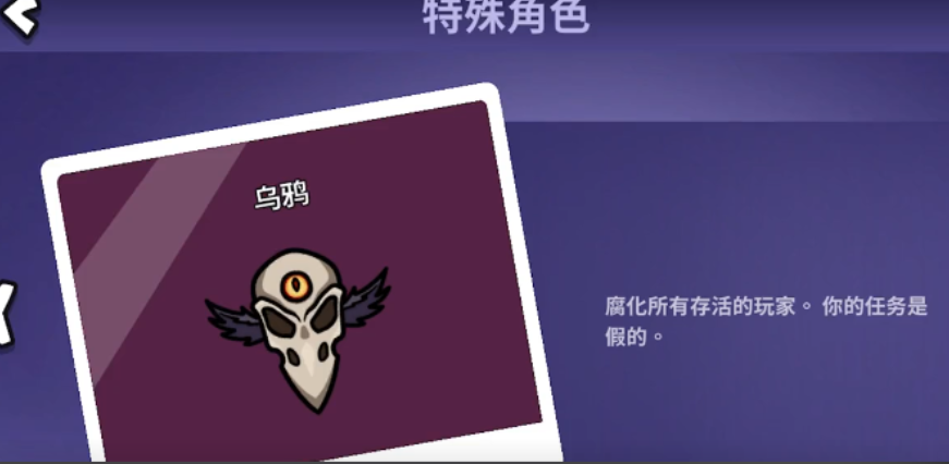 乌鸦的第二个核心机制围绕腐化与乌鸦时间展开。乌鸦需要通过技能使所有存活的玩家进入腐化状态,好人阵营和中立玩家在感染后数秒会知晓自己已被腐化。当所有存活玩家均被腐化后,乌鸦将觉醒并化身成本体,进入持续1分钟的乌鸦时间。在此期间,乌鸦处于无敌状态,并且拥有无冷却的超大范围击杀能力,可以快速清除场上的玩家。乌鸦的胜利条件便是在这1分钟的倒计时结束前,清除所有其他玩家,实现清场。若倒计时结束时仍有玩家存活,乌鸦则会自爆身亡,宣告失败。